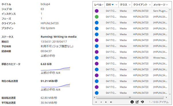 ジョブ詳細: このエリアには、ジョブ・タイトル、ジョブID、インスタンスID、フェーズ番号、クライアント名、プラグイン名、ステータス、開始時間、予測完了時間、経過時間、移動されたデータのサイズおよびデータ転送チャート、現在の転送率およびデータ転送チャート、最大転送速度、平均転送速度のような詳細が表示されます。 フィールド:Plug-in for NDMPを使用してジョブを実行すると、デバイス待ち、経過転送時間、推定転送残量、推定残り時間などのフィールドも表示されます。 フィールド:Plug-in for SnapMirror to Tapeを使用してジョブを実行すると、デバイス待ちおよび経過転送時間も表示されます。 ただし、Plug-in for NDMPおよびPlug-in for SnapMirror to Tapeを使用してジョブを実行すると、[予測完了時間]フィールドは表示されません。