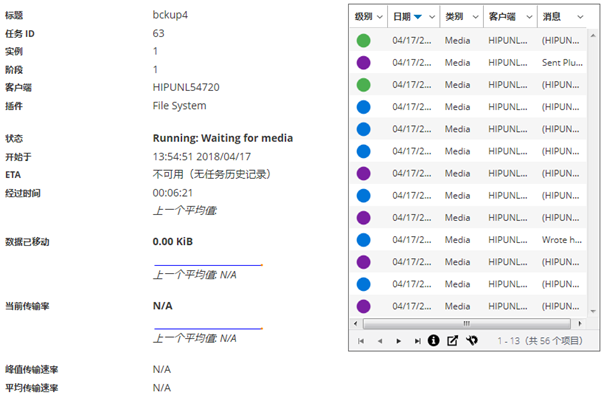 任务详细信息:此区域显示以下详细信息:任务标题、任务 ID、实例 ID、阶段号、客户端名称、插件名称、状态、开始时间、预计完成时间、已用时间、已移动数据大小和数据传输图表、当前传输速率和数据传输图表、峰值传输速率和平均传输速率。在使用 NDMP 插件运行任务时,还会显示以下字段:正在等待设备、已经过的传输、估计剩余传输和估计剩余时间。在使用 SnapMirror 到磁带插件运行任务时,还会显示以下字段:正在等待设备和已经过的传输。但是,在使用 NDMP 插件和 SnapMirror 到磁带插件运行任务时,不会显示“预计完成时间”字段。