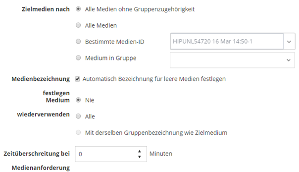 Der Standardwert beträgt Null (0). Bei der Standardeinstellung wartet der Datenkopierjob unendlich lang darauf, dass das Medium bereitgestellt oder der Job manuell abgebrochen wird.