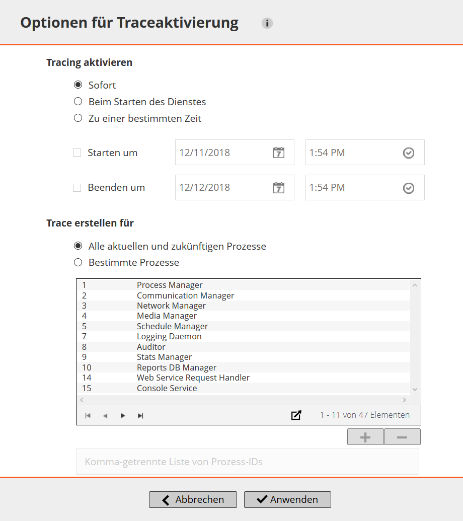 Geben Sie die Prozesse an, für die Tracedateien benötigt werden: