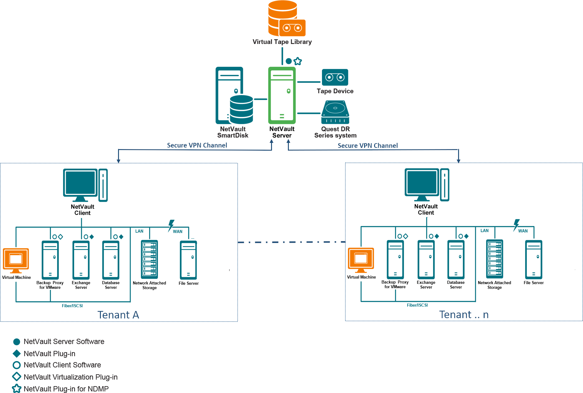 The NetVault Clients are assigned to a NetVault Server, which manages all data protection operations for the clients. A single server and its associated clients form a NetVault Domain. In MSP environment, the tenants NetVault client communicates with NetVault Server and devices, through secure channel (VPN).