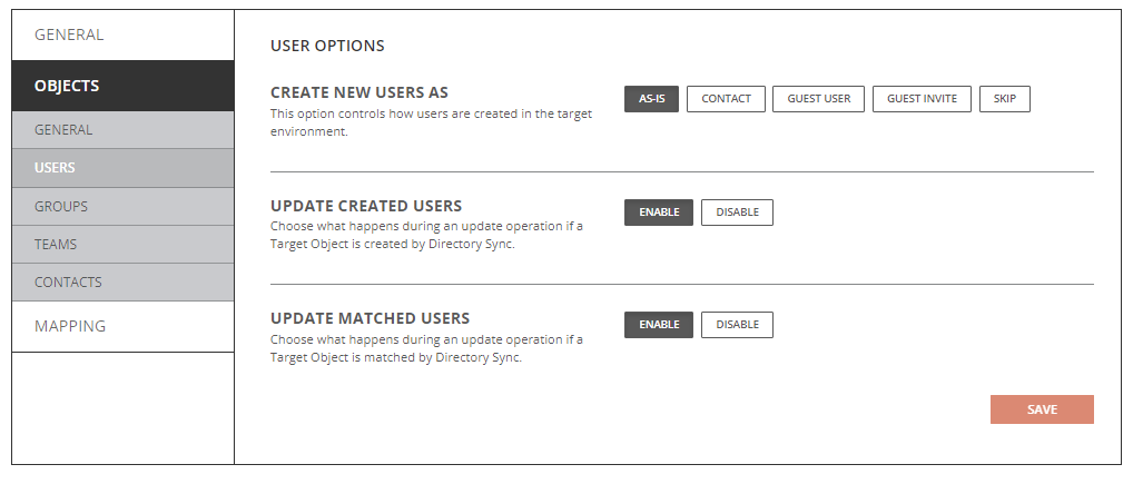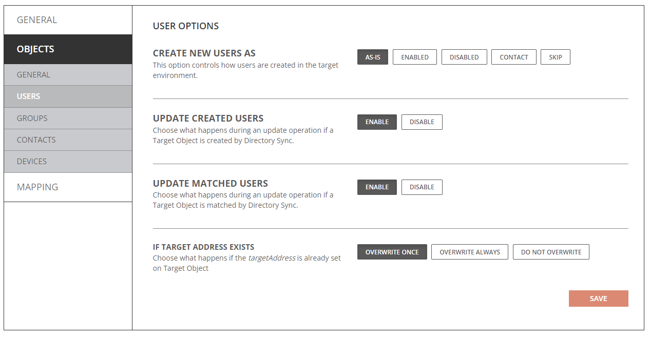 • Disabled: Object changes will not be synchronized to the target during delta sync after the users were created by Directory Sync.
