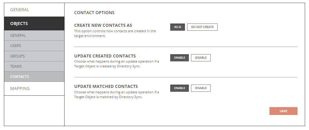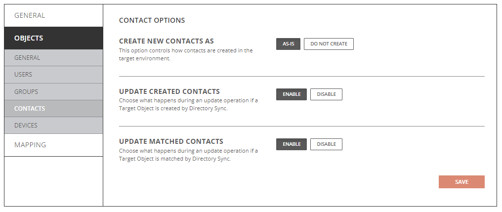• Disabled: Object changes will not be synchronized to the target during delta sync after the contacts were created by Directory Sync.