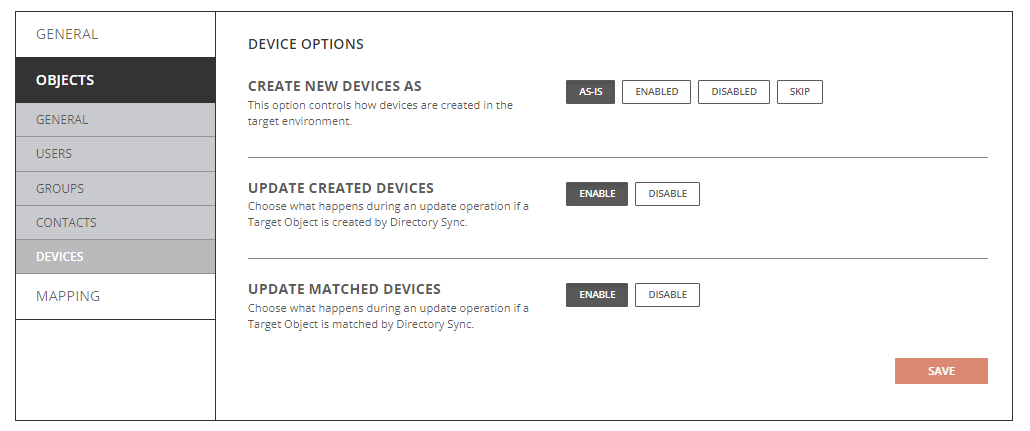 • Disabled: Object changes will not be synchronized to the target during delta sync after the devices were created by Directory Sync.