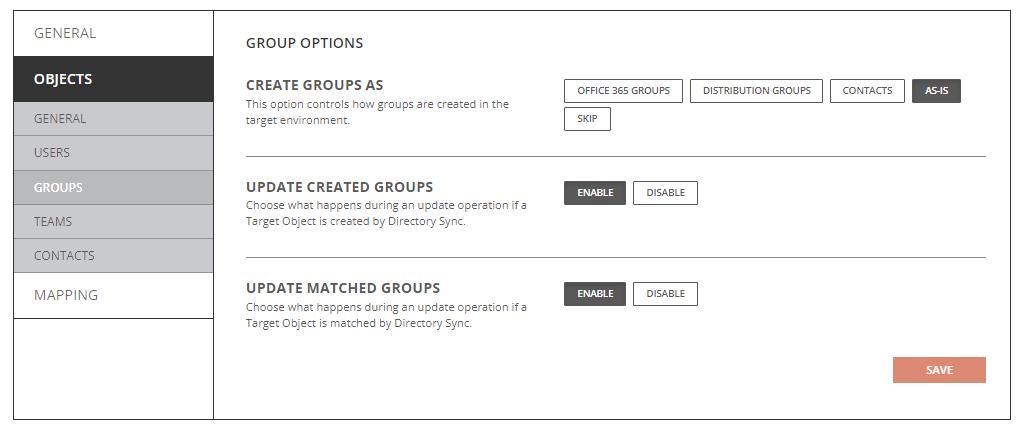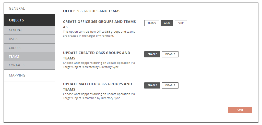 • Office 365 Groups: Objects will be created as Office 365 Groups(Unified Groups) in the target.