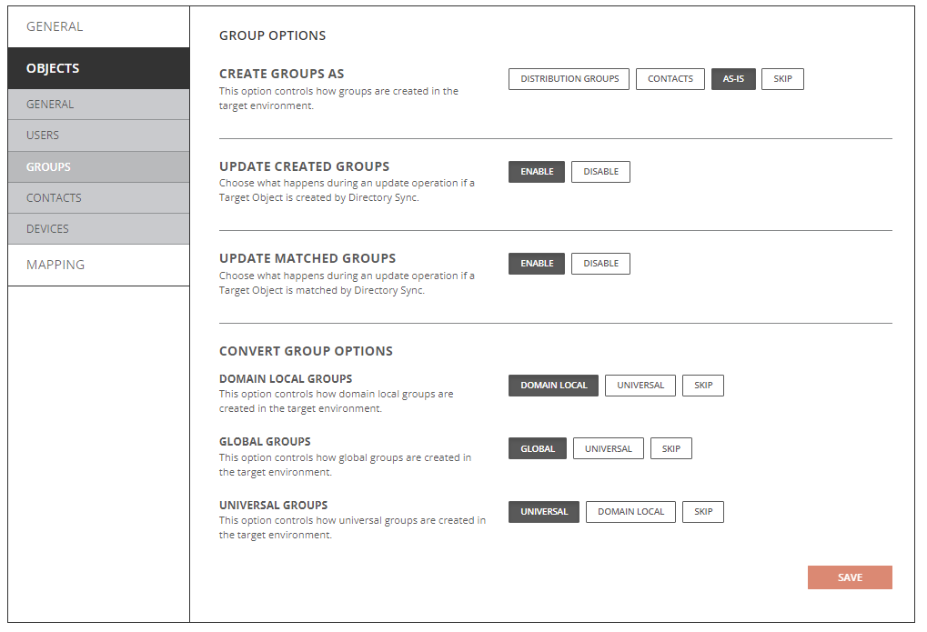 • Distribution Groups: Objects will be created just as Distribution Group in the target Active Directory.