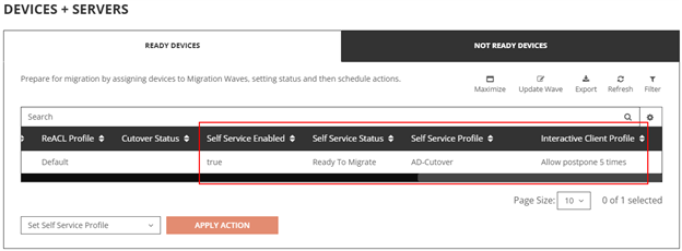 NOTE: Once you assign a self-service profile, the device cutover must be performed from the self-service portal using the scheduler or by selecting the Migrate Now option; you will still be able to perform all non-cutover actions from the Ready Devices table in ODMAD.