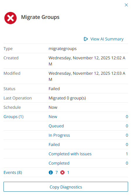 4. View AI Summary - This link is available if you opted for the AI feature in the organization you created (see Organizations and Regions), and the task is a migration task that supports the AI migration assistant and you selected the Generate AI summary option in the Reporting step of the migration wizard. Click this link after the task has completed, to view the AI-generated migration summary.