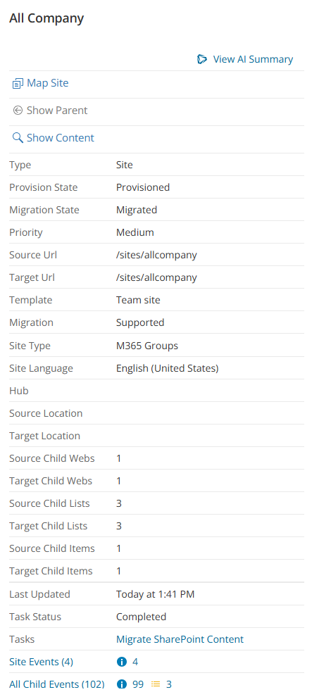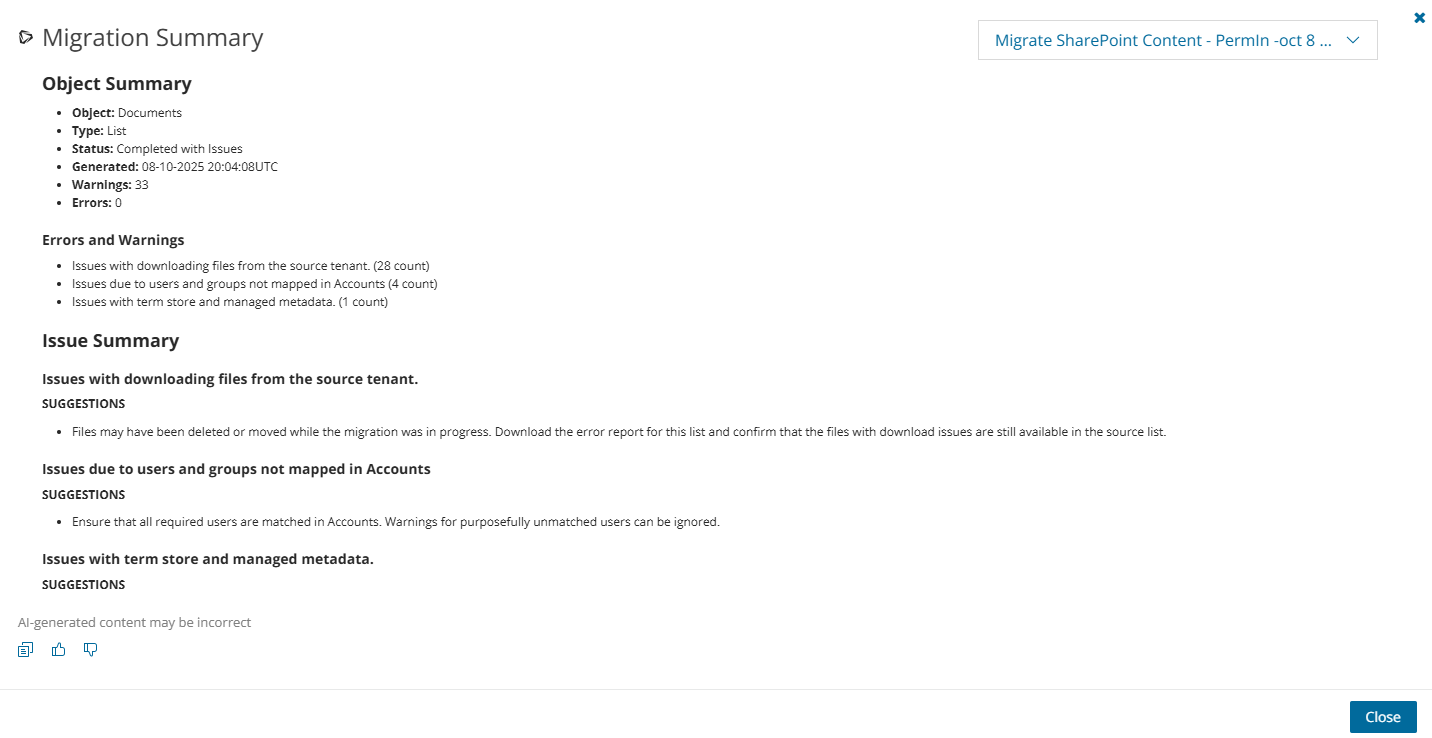 • View AI Summary - This link is available if you opted for the AI feature in the organization you created (see Organizations and Regions), and the task is a migration task that supports the AI migration assistant and you selected the Generate AI summary option in the Reporting step of the migration wizard. Click this link after the task has completed, to view the AI-generated migration summary.