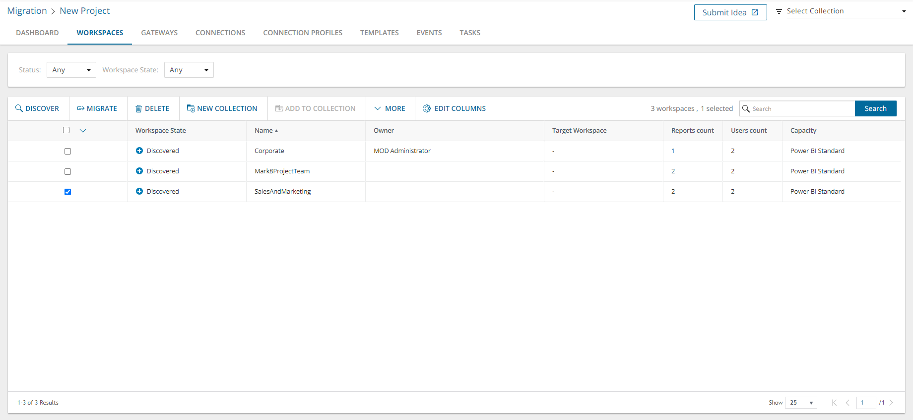 Workspaces, Gateways and Connections can also be discovered separately using dedicated discovery tasks that are usually recommended for the discovery of newer Power BI objects, such as a refresh from the source tenant. |