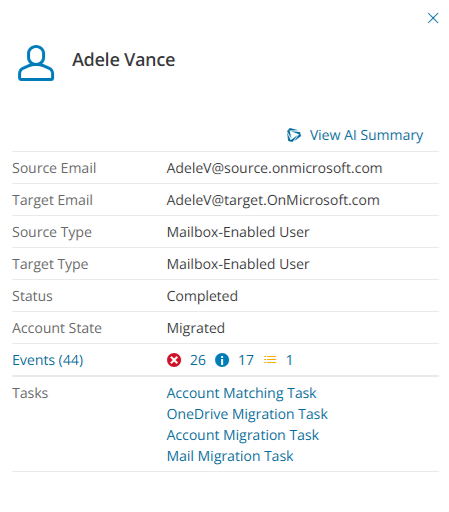 - View AI Summary - This link is available if you opted for the AI feature in the organization you created (see Organizations and Regions), and the task is a migration task that supports the AI migration assistant and you selected the Generate AI summary option in the Reporting step of the migration wizard. Click this link after the task has completed, to view the AI-generated migration summary.