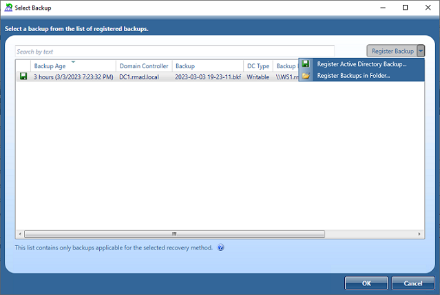 The registering of backups can be done via PowerShell® as a parameter has been added to the Add-RMADBackup cmdlet to allow an integrity check to be performed after the backup has been registered in the Active Directory database.