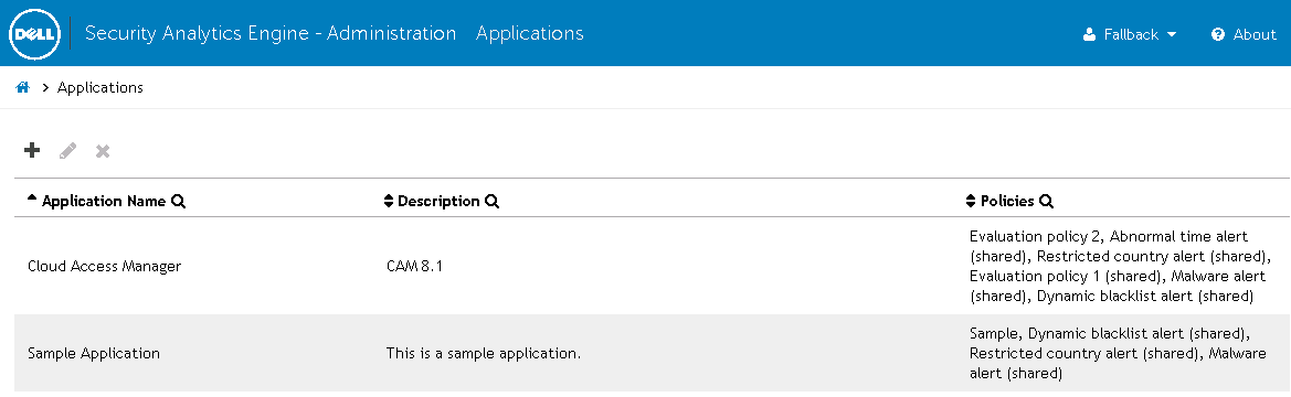 The Applications page is displayed when Applications is clicked on the Home page of the Security Analytics Engine Administration web site. From this page you can launch the Application wizard to add new or edit existing applications, and create and manage the risk policies being used by applications.