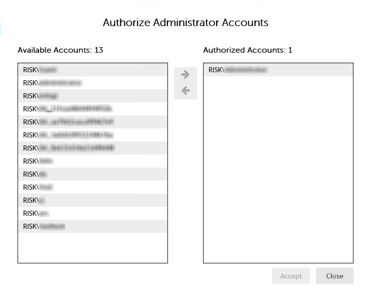 Click Search to open the Authorize Administration Accounts dialog and display the results of your search.