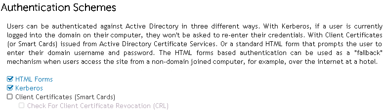 NOTE: When users are already logged into their Windows® machines this may seem a redundant step which defeats the purpose of single sign-on. However, it is recommended that this option remain selected because the HTML Forms authentication can be used as a fallback mechanism when users access the site from a non-domain joined computer (e.g., over the internet at a hotel).