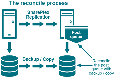 Use the reconcile command as part of a procedure to synchronize (instantiate) source and target data with minimal interruption to the database users. The reconcile command coordinates the results of ongoing replication with a copy of the source data that is applied to the target system, such as that applied by a hot-backup or a native copy utility. The reconcile function compares the replicated changes in the post queue with the state of the target database after the recovery process. It differentiates between the transactions that were applied during recovery from those that have not yet been applied (still waiting in the post queue), and it only posts the non-duplicated changes so that both systems are synchronized.