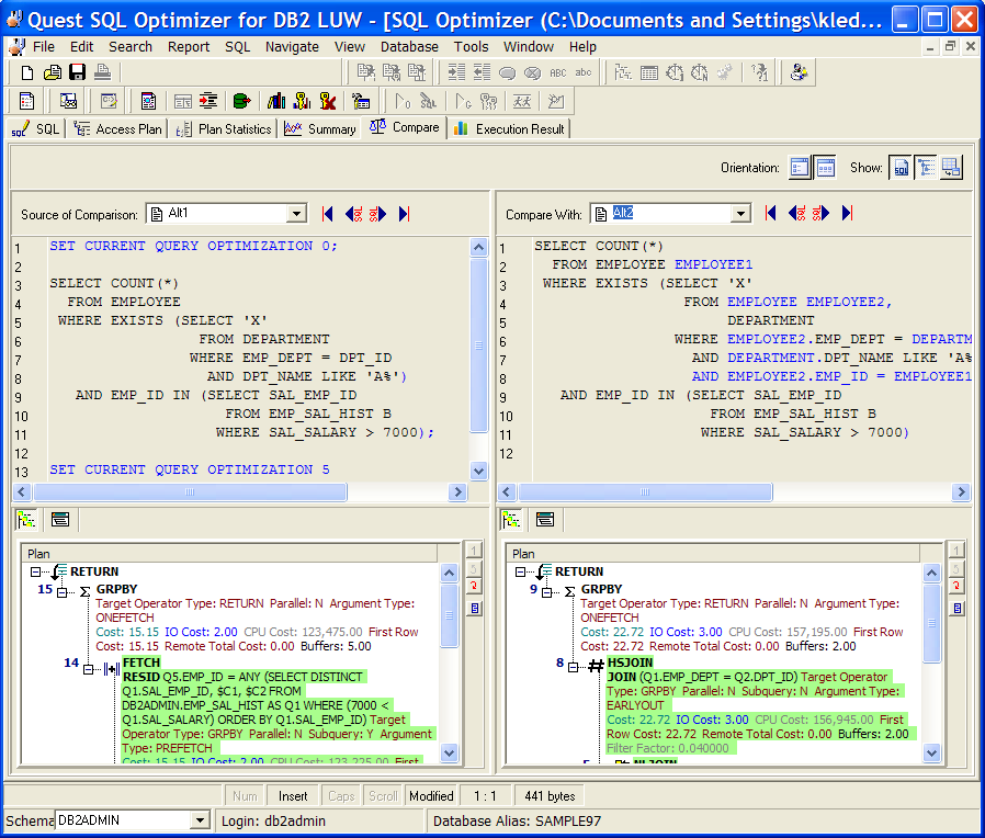 The Compare tab in the SQL Optimizer window enables you easily to compare SQL text, access plans, and statistics between two alternatives or between an alternative and the original SQL.