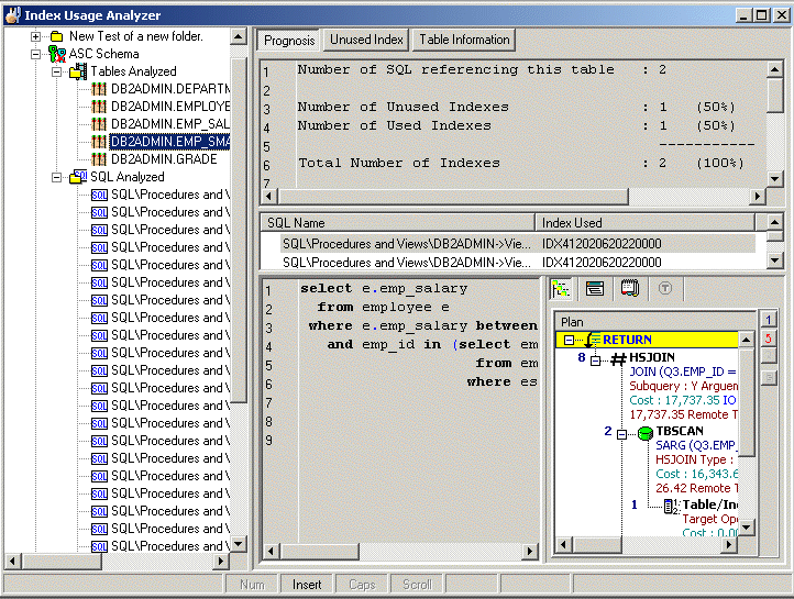 The Index Usage Analyzer identifies unused indexes by analyzing access plans from SQL statements in your database applications. It examines their access plans and reports any indexes in the database that are not used. You can use this module to quickly identify the indexes in databases that are not contributing to the performance of the database applications. These unused indexes can then be deleted to free up space and improve the speed of the database applications and maintenance.