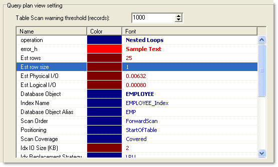 Specify the font settings of the individual items in the query plan by clicking the Font column in the row for the item and selecting the new settings from the dialog.