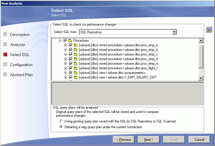 The SQL statements used in an analysis can be taken from the SQL Repository or the SQL Scanner. If you select SQL statements from the SQL Scanner, these statements are added to the SQL Repository.