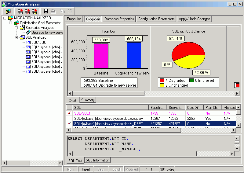 The Migration Analyzer window displays performance analysis information about the SQL statements and query plans analyzed between two Adaptive Server versions. For each performance analysis selected from the tree view in the left pane, overall performance change metrics and details on query plan changes are provided in the right pane.