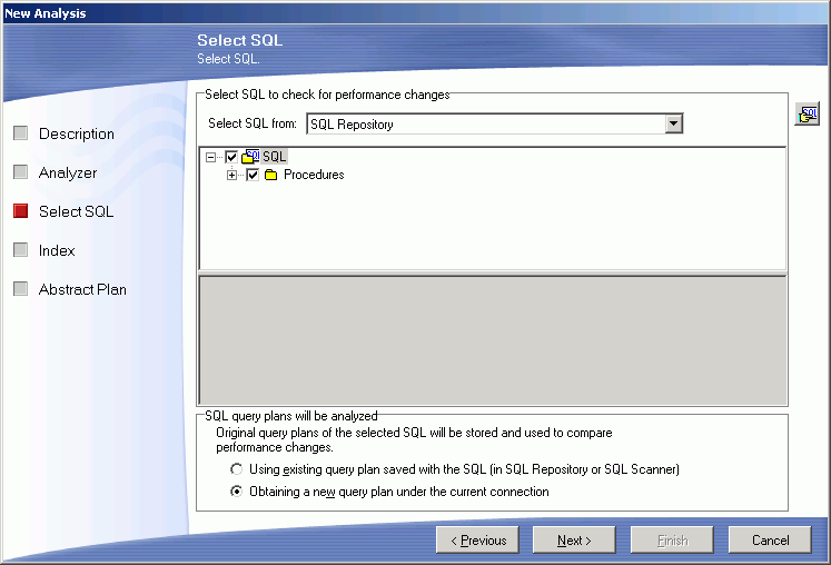 The SQL statements used in an analysis can be taken from the SQL Repository or the SQL Scanner. If you select SQL statements from the SQL Scanner, these statements are added to the SQL Repository.