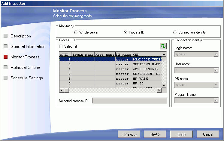 Monitor all SQL statements currently running which have the specified process ID (spid). The Process ID grid displays information about all current users and processes of the database server, displaying the process ID (spid), login name, server name, database name and the command type currently executing. Click the row of the grid to select the process ID you want to monitor. To select all the process IDs, click the Select all checkbox. | |