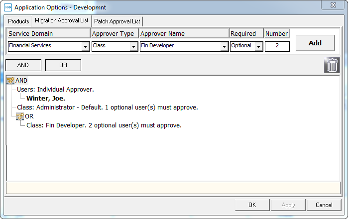 If an environment requires the approval of certain users before an archive set can be migrated into it or a patch can be applied, you can specify who these users are in the Migration Approval List and Patch Approval List tabs of the Application Options window. To open this window, select the environment you want and click App Options in the Oracle Application Environment Connection Maintenance table.