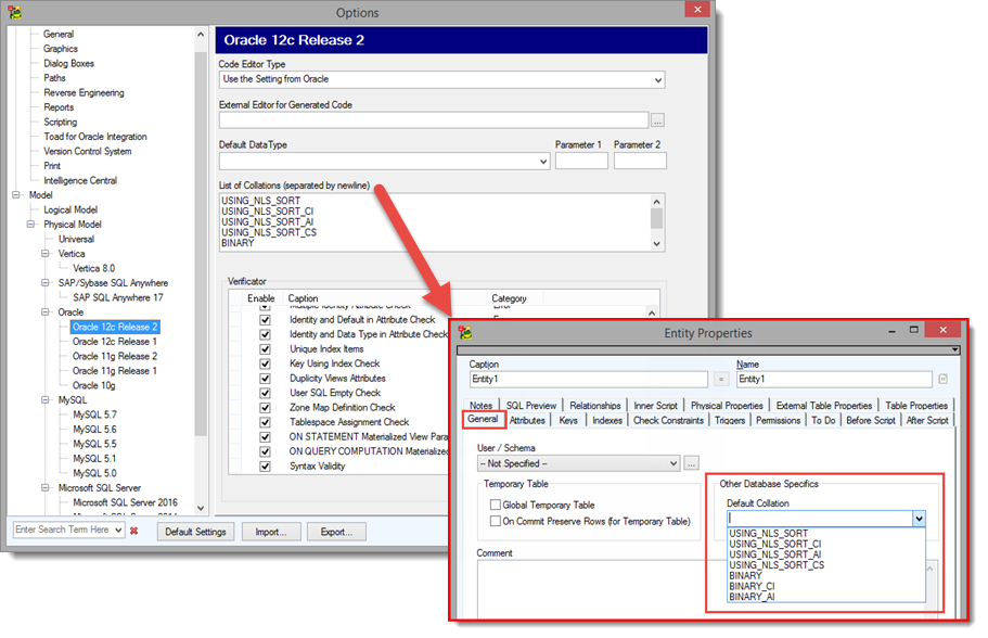 • Options are available in Options | Model | Physical Model | Oracle | Oracle 12c Release 2