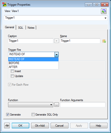 • if INSTEAD OF is used, the FOR EACH ROW checkbox must be applied