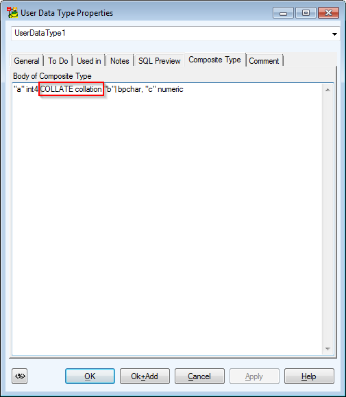 COLLATE collation definition can be used for every attribute to set its Collation. To set Collation, manually write COLLATE collation expression in Composite Type tab right after "attributename datatypename" definition (see the screenshot above). Toad Data Modeler will load it during RE.