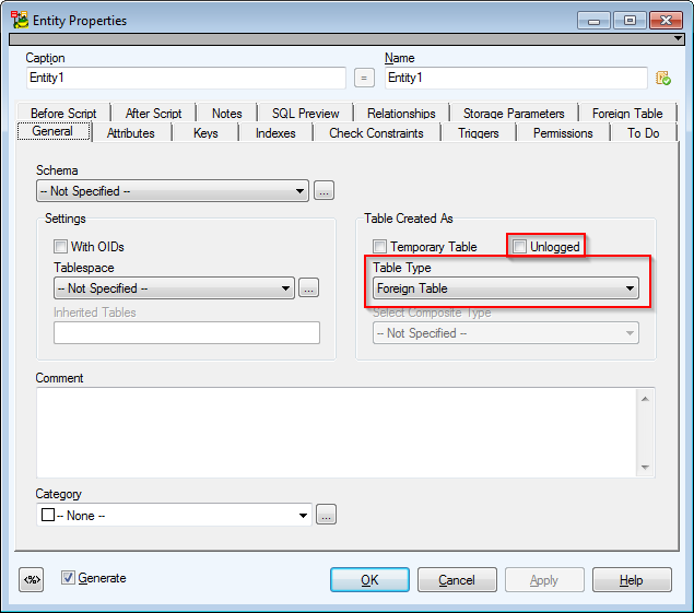 When Foreign Table is selected in the Table Type combobox, a new Foreign Table tab displays.