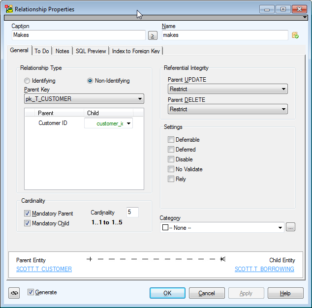 Select this option to set the relationship as identifying or non-identifying. There are also several setting related to Parent and Child entities. The last checkbox gives you the option to create Index to Foreign Key in Child Entity.