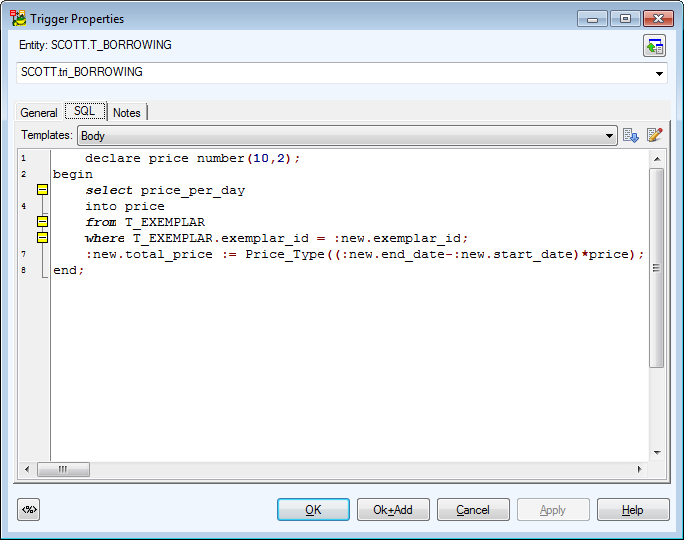 Example: Trigger Properties dialog | SQL tab (Oracle 10g db)