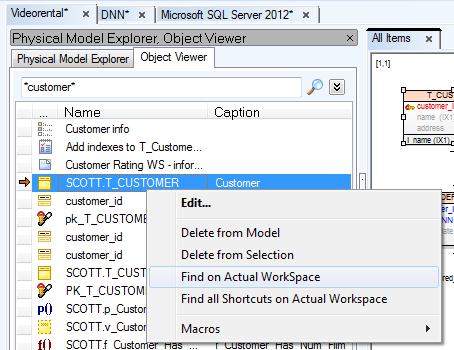 Object Viewer displays a complete lists of all objects in your model. You can find and highlight any selected object (and also its shortcuts) by right-clicking it and selecting Find on Actual Workspace or Find all Shotcuts on Actual Workspace.