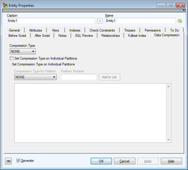 On this tab, you can set Data Compression either for all indexes (combo box "Compression Type") or for particular partitions. (To accomplish this, it is necessary to select checkbox Set Compression Type on Individual Partitions and fill out the box in the Set Compression Type on Individual Partitions area. See the auxiliary combo box Compression Type for Partition, box Partition Number and button Add to List).