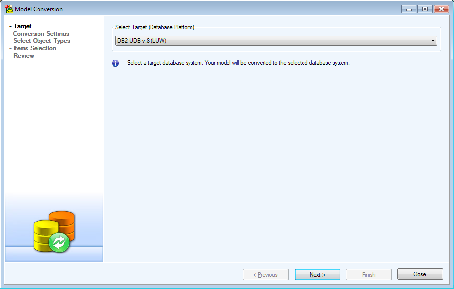 Note: Converting between different platforms means that some items, which contain SQL code, may not be converted correctly (e.g. After Scripts, Before Scripts, Procedures...). In this case, it is recommended to check the Comment Out Database Specific Items checkbox. This way, SQL code, that cannot be successfully converted, will be commented out. You can review these parts of code later and fix them on your own. |
