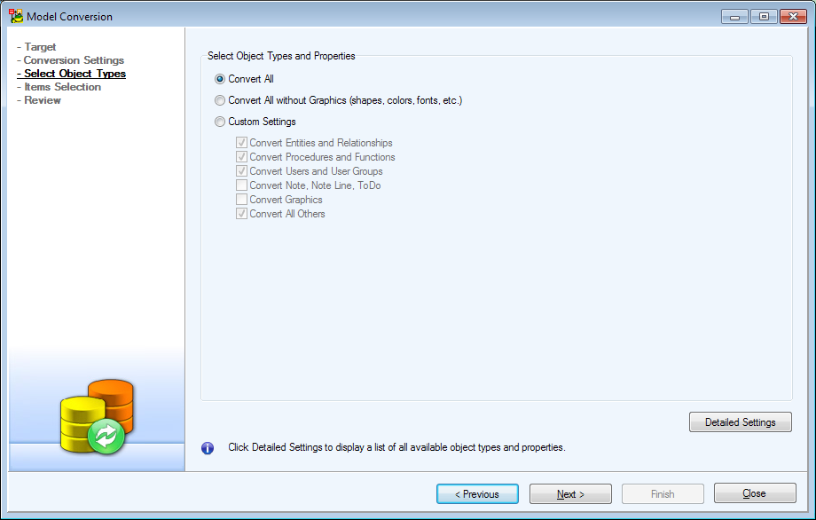 - Choose what object types will be converted. You can access full list of Objects and Properties by clicking on Detailed Settings.