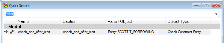 The following example shows search results of string tcr. Results include T_CUSTOMER_RATING.
