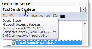 • To view the number of actual database connections that exist for a Toad connection, including the number of active connections, place the cursor over the connection in the Connection/Navigation Manager pane or in the connection drop-down list.