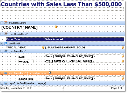 8. Enter Countries with Sales Less Than $500,000 in the Report Title field, and then click Finish. The initial report layout displays in the Report window with the information grouped under bands. See Add Report Bands for more information for more information about bands.
