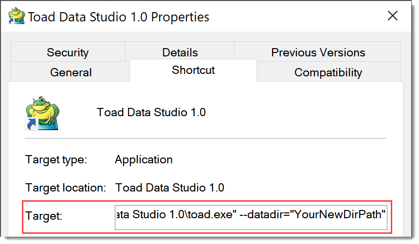 To instruct Toad to always use the new directory path, add the command switch and the new directory path to a Toad desktop shortcut. Then use the desktop shortcut when opening Toad.
