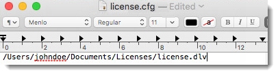 - Open license.cfg and enter a path to each license file on a new line or separate them by a semi-colon (;), e.g. “Users/johndoe/Documents/Licences/license.dlv”