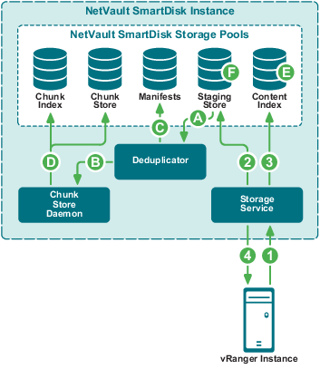 After the user initiates a backup job targeted to the NetVault SmartDisk repository, vRanger streams data on the user-defined port to the Storage Service. |