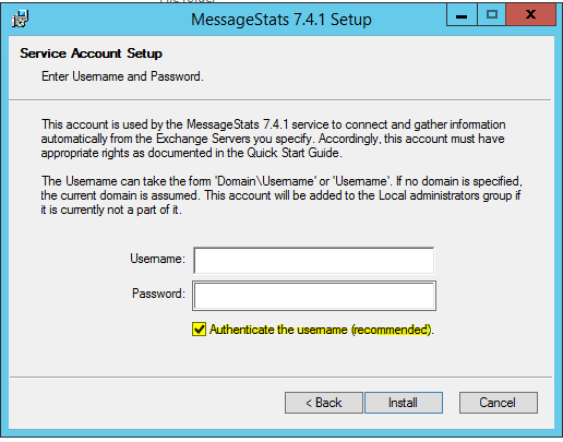 The service account setup window is also missing the password box, so the credentials cannot be verified: