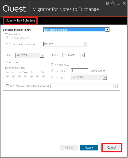 10.) You can either schedule the migration task to run, or on the "Specify Task Schedule" screen you can click Cancel to successfully save the new changes: