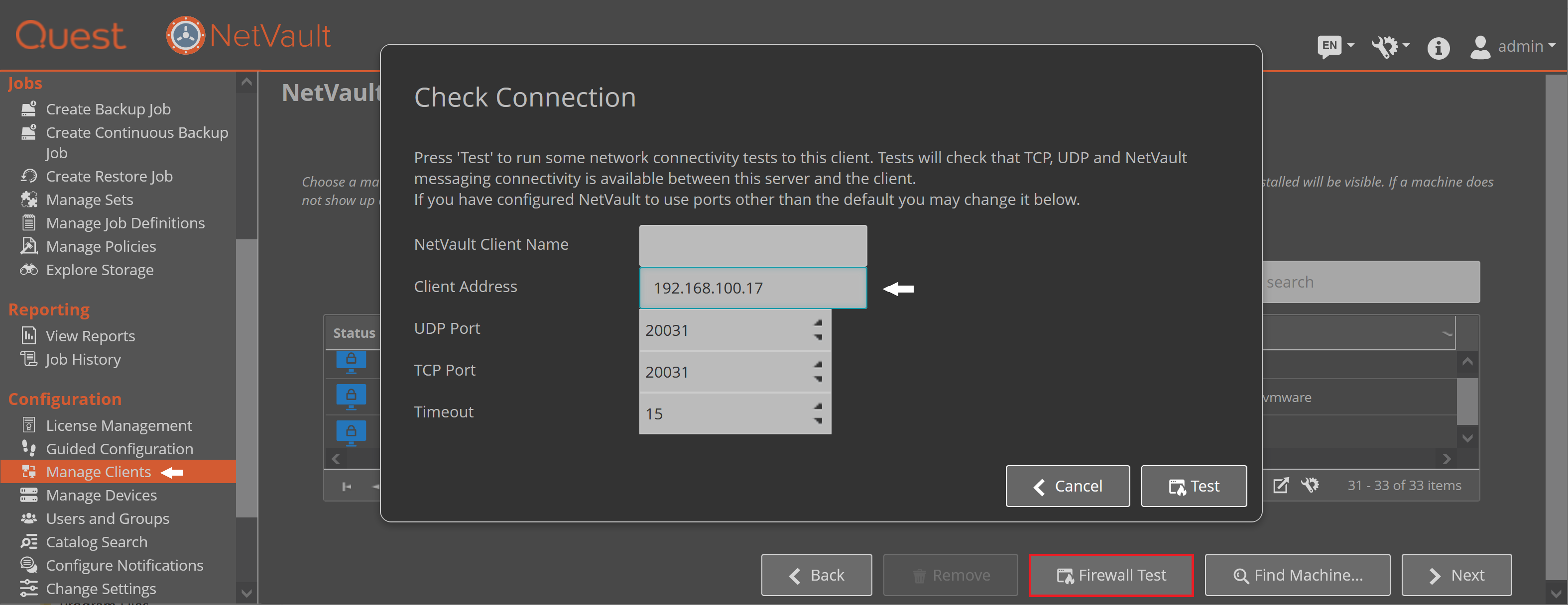 Since NetVault 10.0.x, NetVault offers a "Firewall Test" from the Manage Clients screen. As the comments on the "Check Connection" pop-up explain. This tests UDP and TCP communication between the NetVault Server and the selected Client using the default port number of 20031. If you have reconfigured NetVault to use a different port as explained in How to reconfigure NetVault to use a different port number, then you can use the arrows to select the port number that you have configured NetVault to use.
