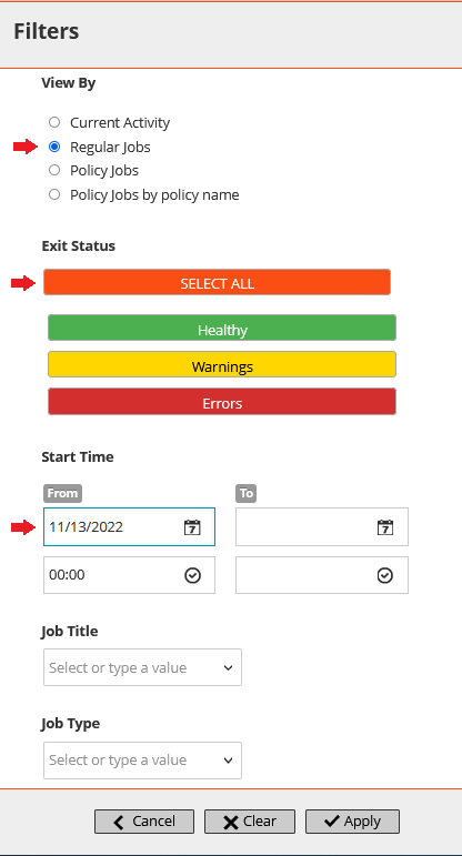 First, please ensure that the jobs with errors are not filtered out. By default, the Job Status table only displays items from the past 7 days as specified by the Start Time field: