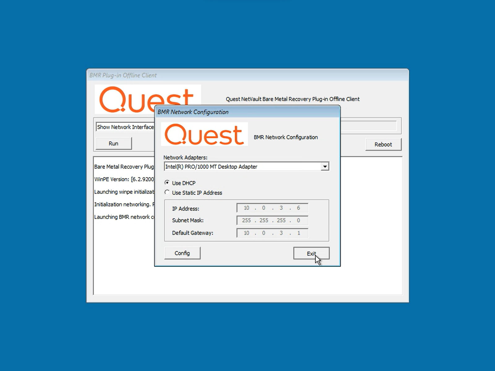 - On the BMR Network Configuration dialogue box, press the [Config] button to obtain an IP address by DHCP or input the IP Address, Subnet Mask, and Default Gateway if configuring a static one. Apply the changes by pressing the [Exit] button.