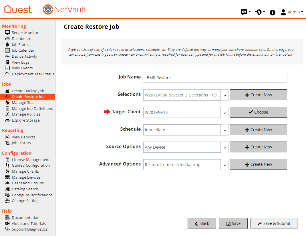 - On the Create Restore Job screen, select the NetVault Server from the Target Client drop-down list.
